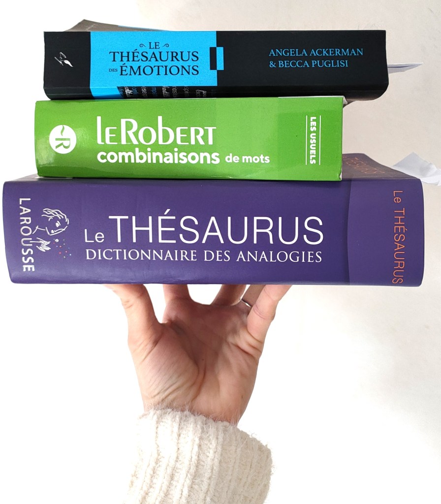 Heureusement pour moi, j’ai investi (tard malheureusement), dans trois superbes (non) ouvrages : un thésaurus des analogies, qui m’a littéralement sauvée, un thésaurus des émotions, qui sait me dépanner et me permettre de trouver le bon mot dans le thésaurus des analogies, et un Robert des combinaisons de mots, qui me sert essentiellement de presse-papier. Oui, c’est important à la création un presse-papier, on a tendance à l’oublier…